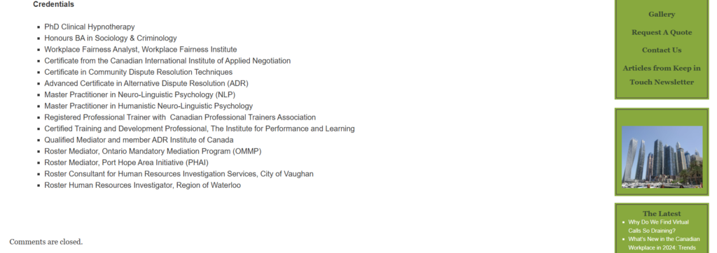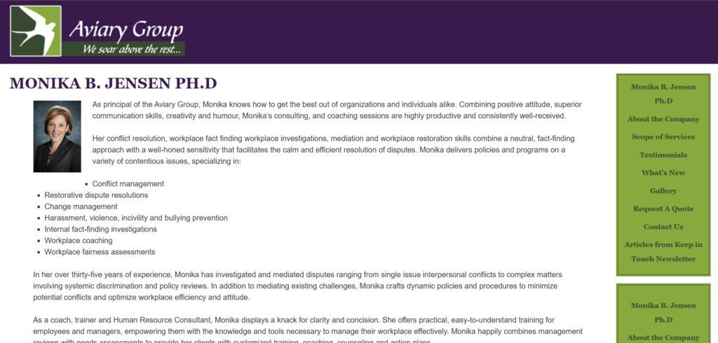 Aviary Group (https://www.aviarygroup.ca) is a seasoned Canadian consultancy founded in 1996 by Dr. Monika B. Jensen, Ph.D., based in Pickering, Ontario. The firm specializes in human resources, conflict resolution, workplace investigations, executive coaching, and tailored training workshops. Their offerings include mediation services, fact-finding workplace investigations, policy development, team restoration, and HR-on-demand solutions, all underpinned by a philosophy inspired by birds’ transformational shedding of plumage—symbolizing renewal and growth .