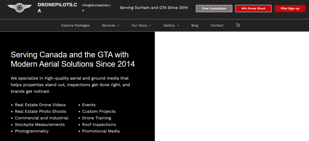 DronePilots.ca is a Canadian aerial services company offering professional drone photography, videography, mapping, and inspection services tailored for real estate, construction, industrial, events, and commercial clients. With Transport Canada-certified Advanced pilots, full insurance coverage, and over a decade of combined industry experience, they deliver high-resolution imagery, virtual tours, rooftop inspections, stockpile measurements, and cinematic cinematography. The site features detailed service packages, a gallery of past work, beginner and regulatory drone guides, a blog, and options to request quotes, access free consultations, or apply as a pilot.